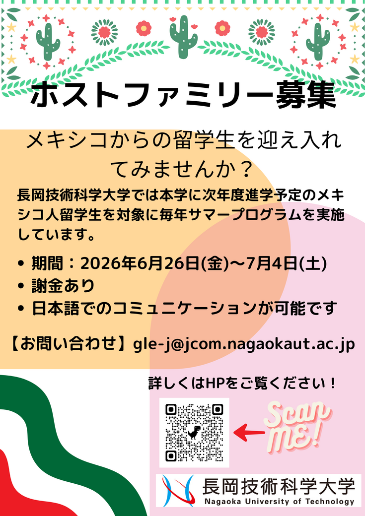 ・モンテレイ大学及びヌエボレオン大学とのツイニング・プログラム学生を上記日程の間、各家庭に1名ずつ受入れを依頼します。