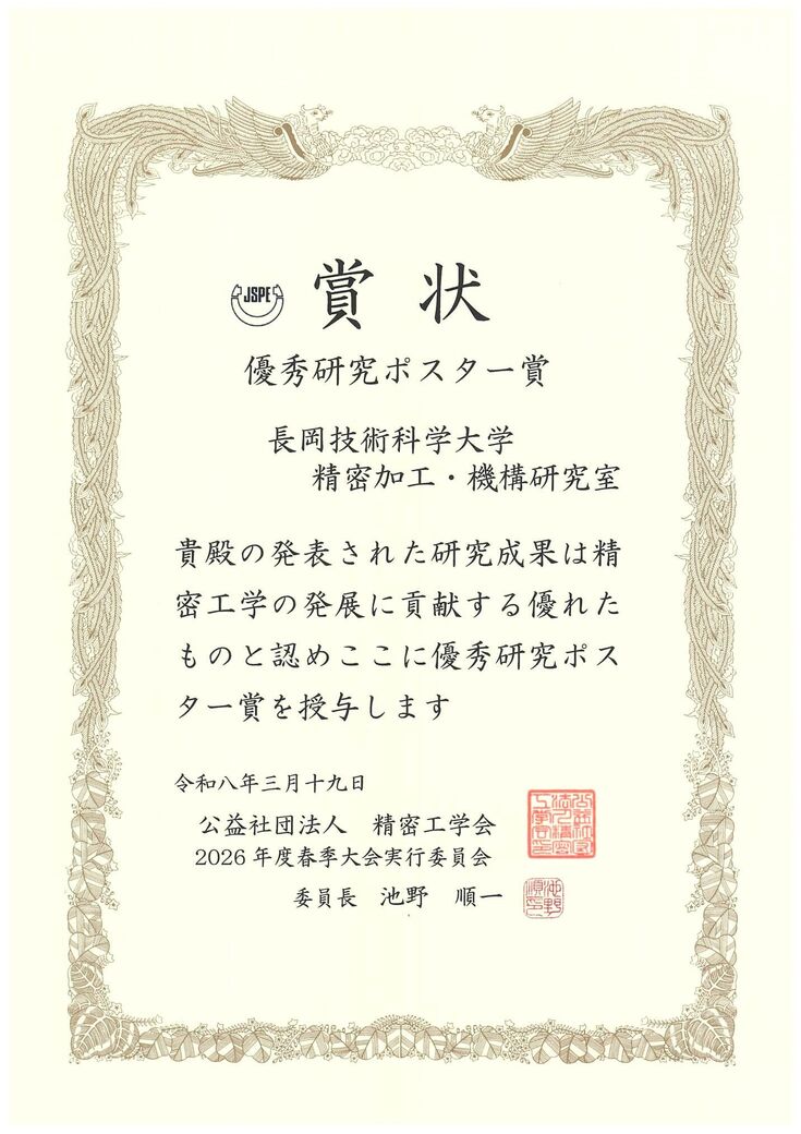 精密加工・機構研究室が2026年度精密工学会春季大会学術講演会にて、優秀研究ポスター賞を受賞しました