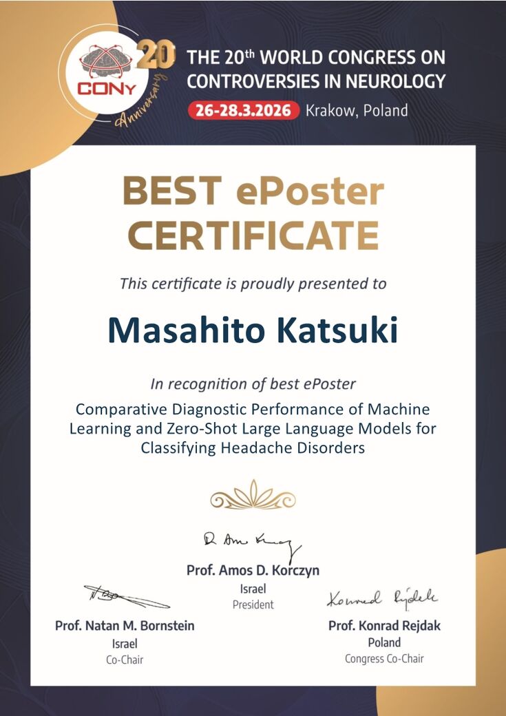 勝木将人准教授がThe 20th World Congress on Controversies in Neurology (CONy)ベストポスター賞を受賞しました