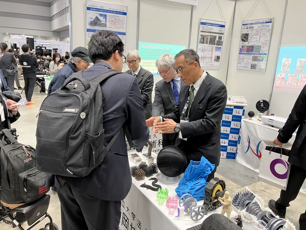 本センターは、最新鋭の3Dプリンターを整備し、ものづくり企業の部材開発などを支援しています。今回のイベントでは、センターで製作した造形物を多数展示するとともに、3Dプリンターを活用した技術開発事例や産学連携組織のDXRものづくりプラットフォームの紹介を行いました。